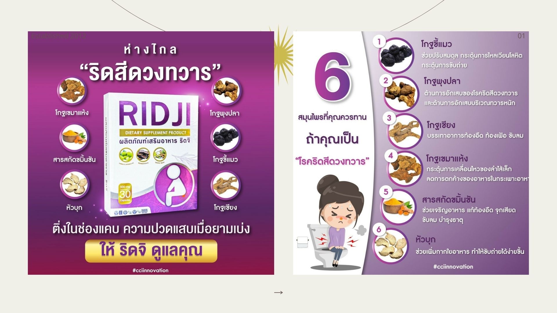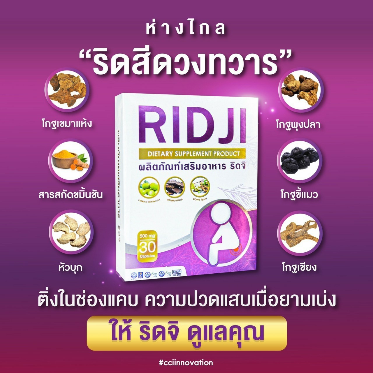 "ริดจิ" ประกอบไปด้วยสำคัญจากสมุนไพร 6 ชนิด ได้แก่ โกฐเขมาแห้ง โกฐพุงปลา โกฐขี้แมว โกฐเชียง หัวบุก และสารกัดจากขมิ้นชัน